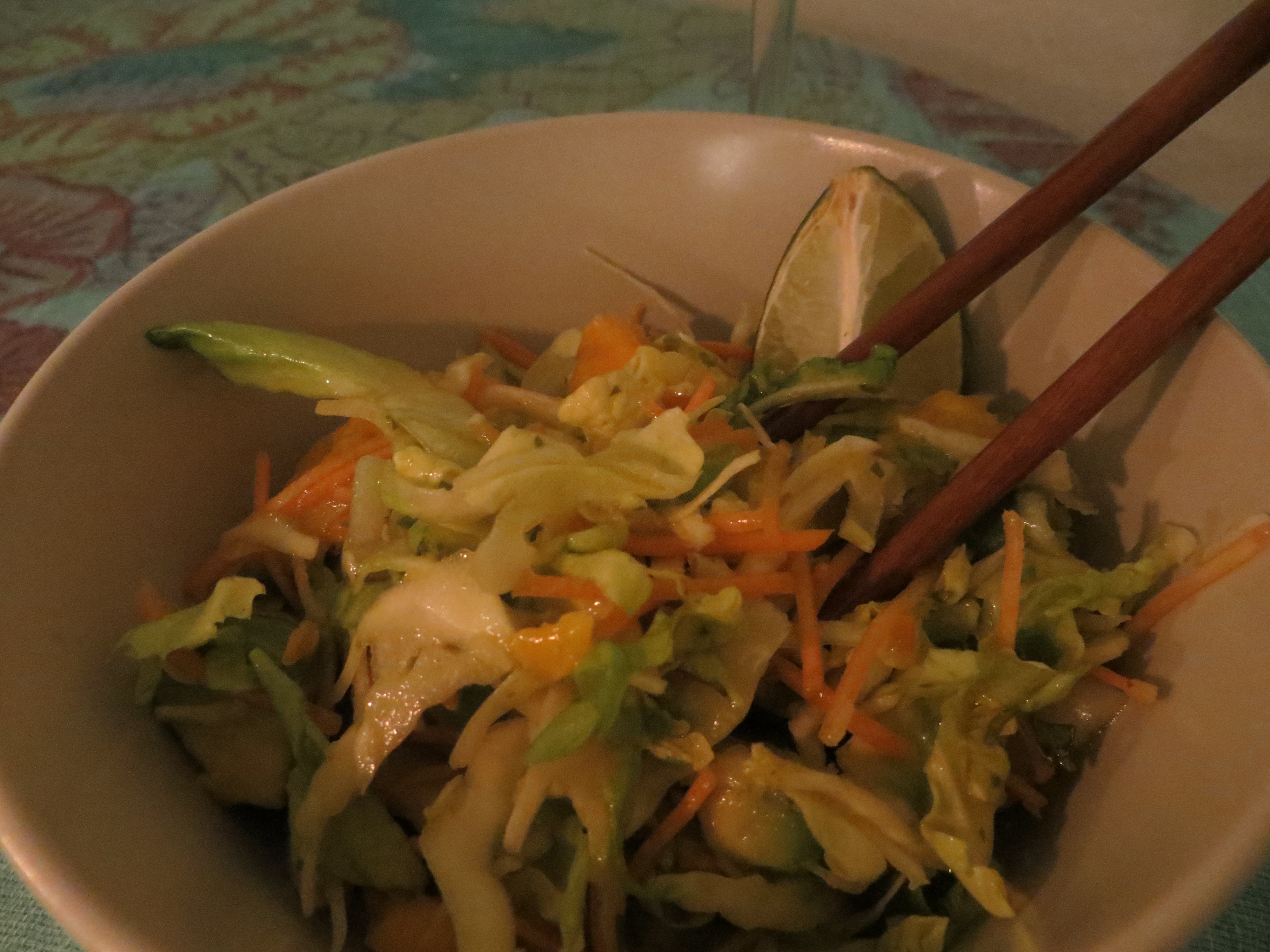 For the salad, chop the head of cabbage and carrot into matchstick sized slices. Dice as much avocado and mango as you would like to add to the mix, leaving the skin off both. I only used half a mango, because it was large.