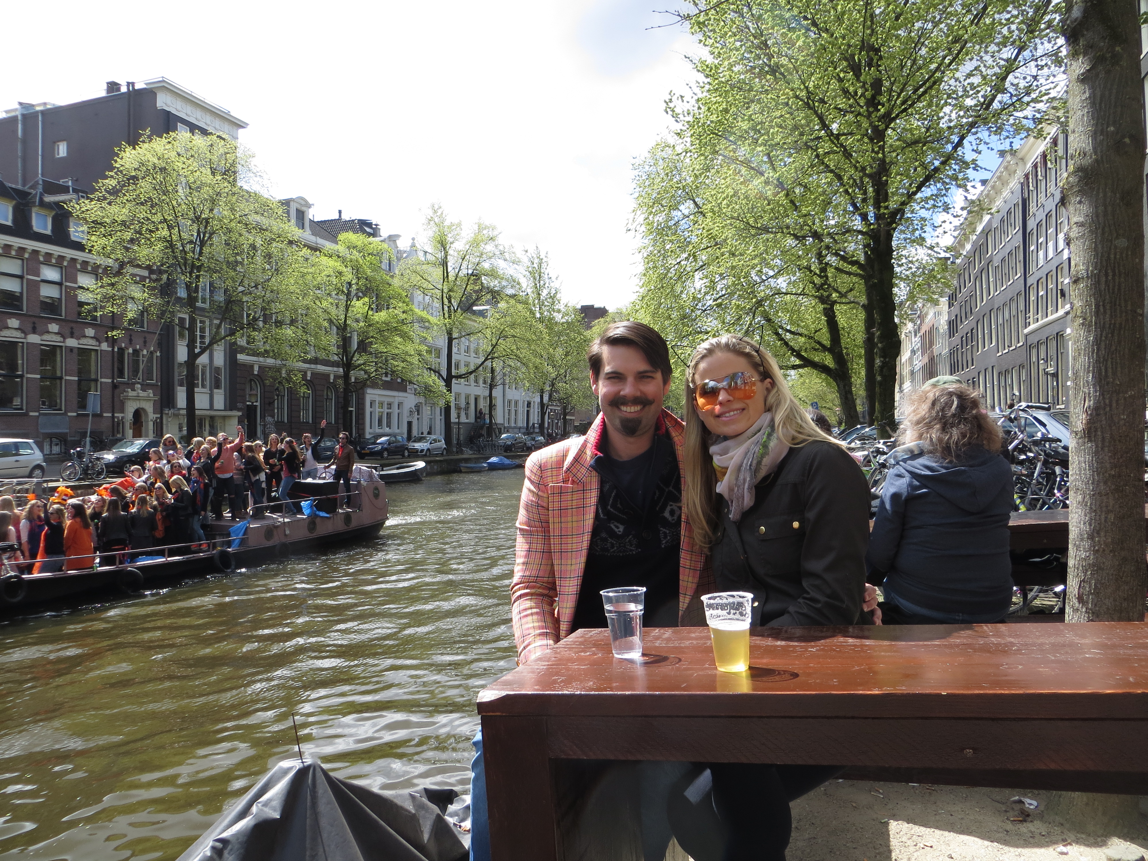 Since most shops and museums are closed on Konigsdag, everyone hangs out along the canals and just generally has a good time. We posted up at a canal side pub to people watch, or um, canal boat watch. As the minutes passed from noon to 2pm, the canal became fuller with boats and the boats became fuller with passengers. Every other boat had a loud sound system, so it was a bit like a DJ was spinning different hits as the boats floated by. Along the bridges and the canals, everyone was dancing and toasting each other. Some boats stirred up the bridge partiers by throwing orange confetti or by spraying them with water guns.