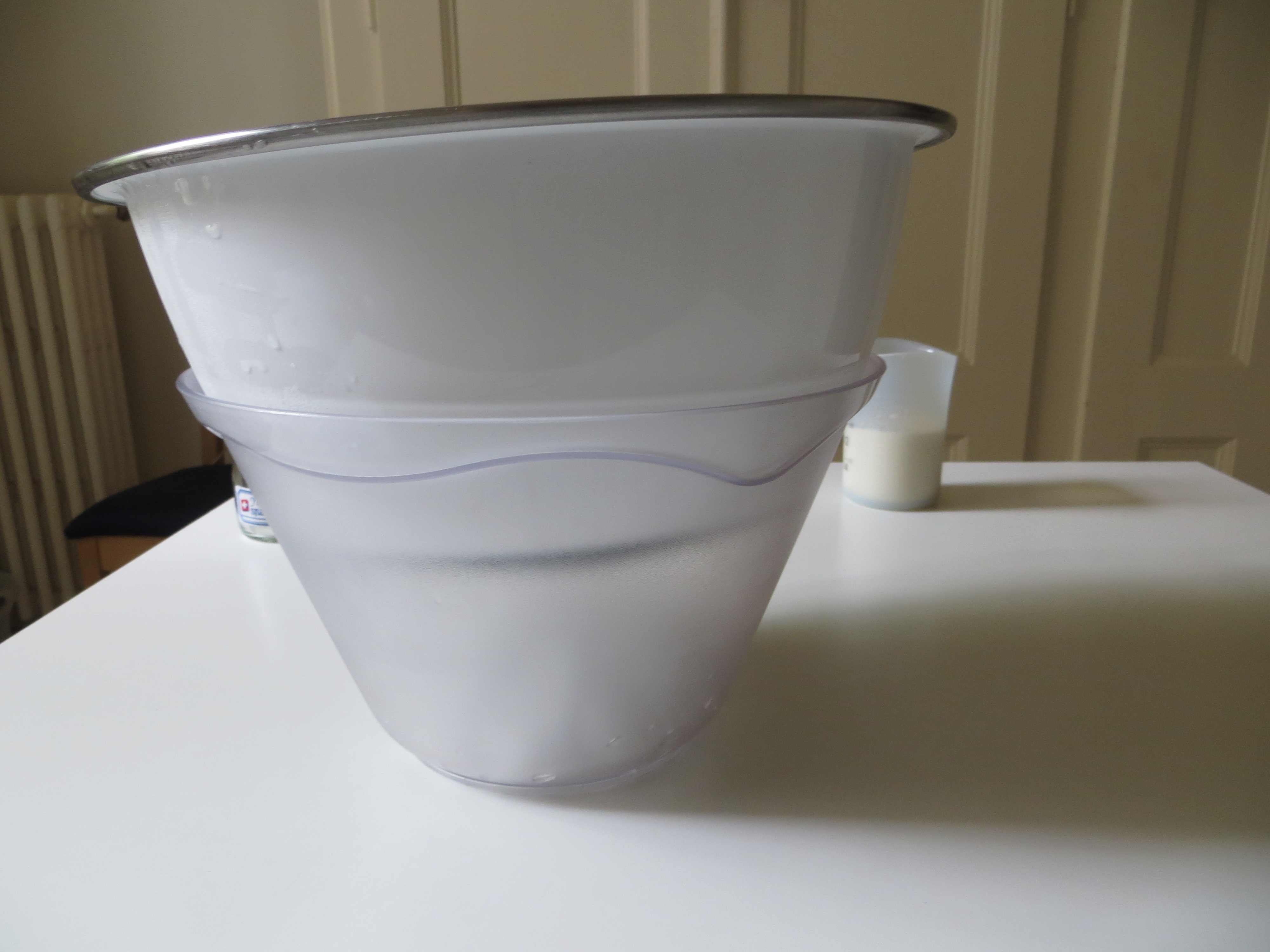 Chop the chocolate roughly and place it in the top of the double boiler. Allow the chocolate to melt, stirring it occasionally to make sure it is not burning. Once the chocolate is completely melted, remove it from the heat. Place the double boiler insert into the mixing bowl filled with ice (see photo below).