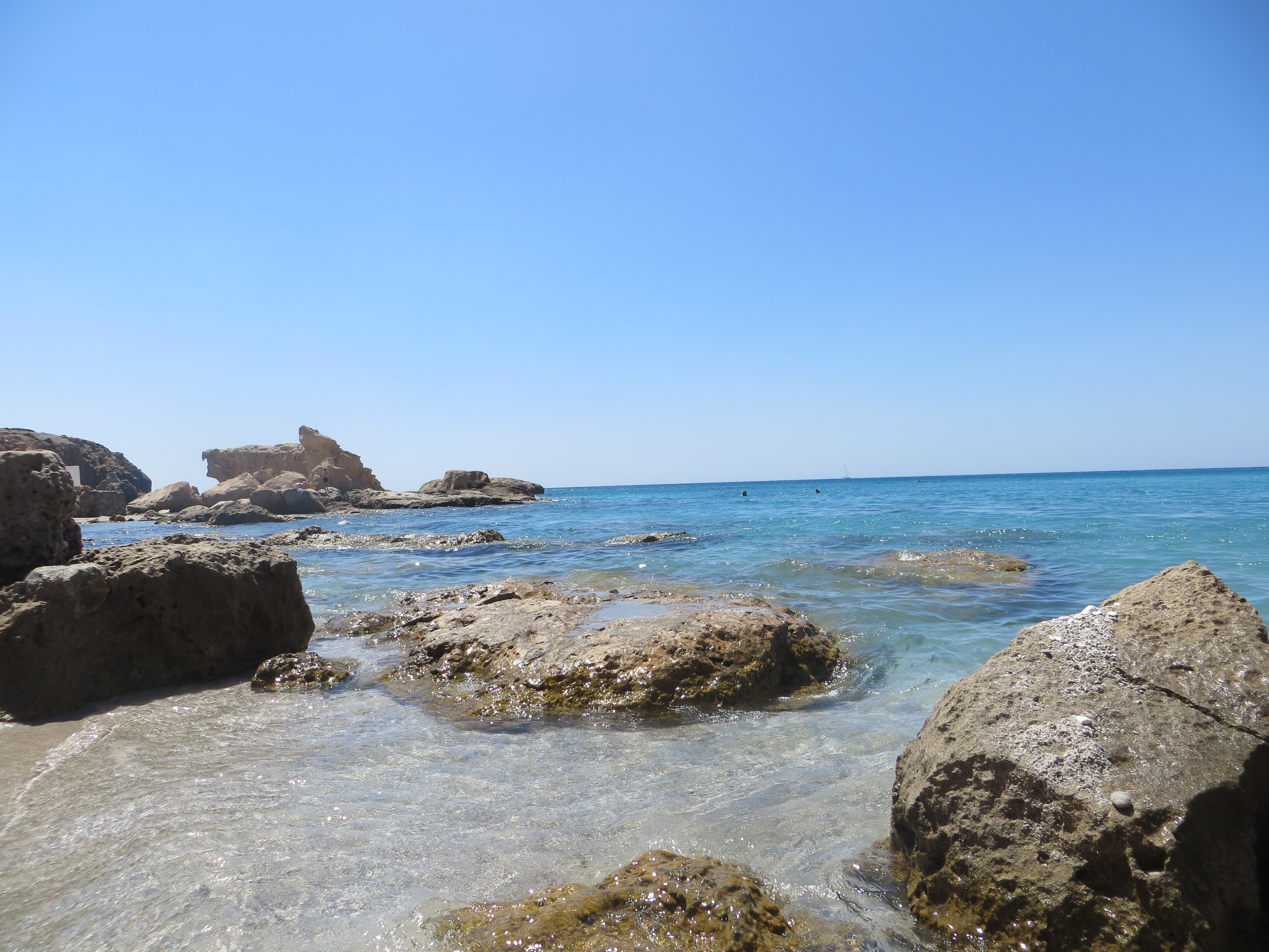 Steep, brightly-colored volcanic ash rock crumble into the shallow, turquoise ocean where bikini-clad snorkelers troll for tropical fish. A tiny island bar, covered in palm fronds, serves Coronas and fresh fruit. The beach feels more like Hawaii than the Greece I had imagined.